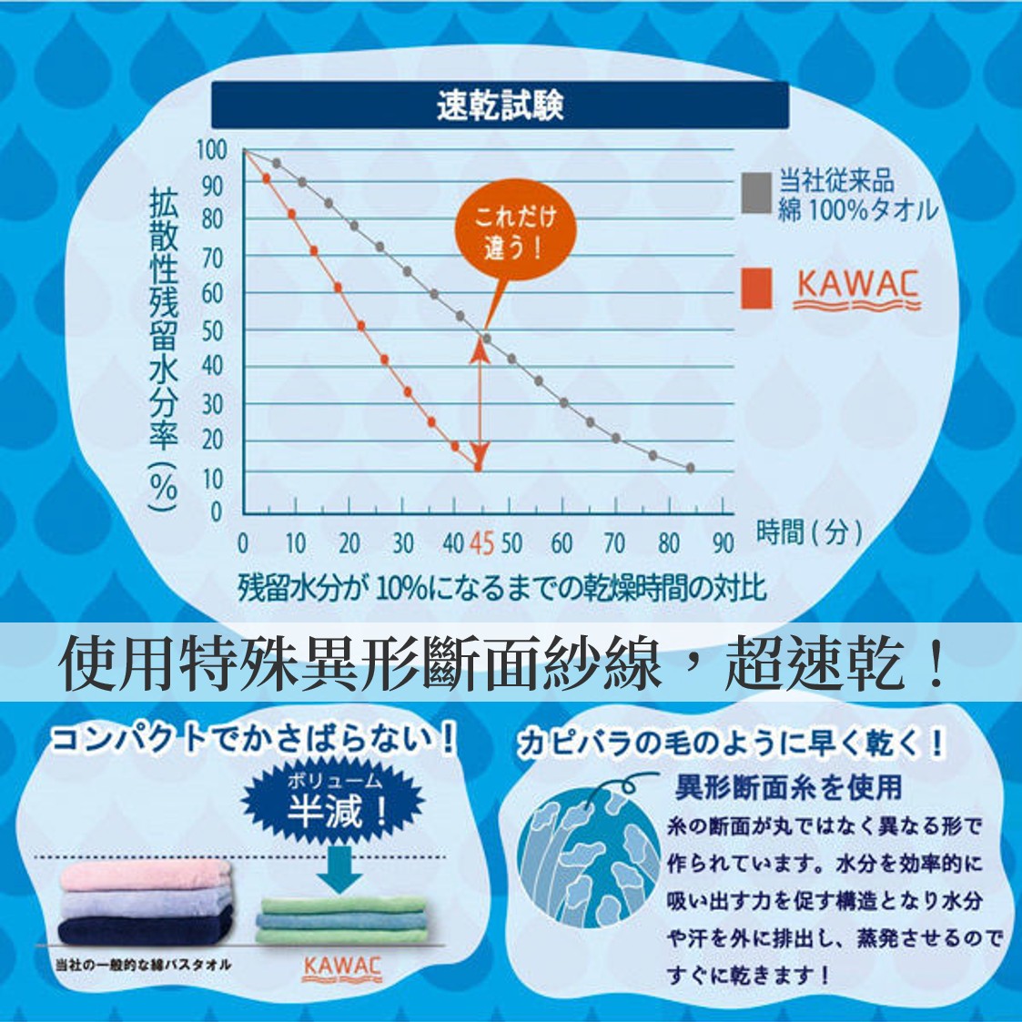 來自日本泉州的知名毛巾廠。自 1946 年創立以來,秉持 「打造日本最好毛巾」的理念,結合 創意、優質素材與精湛織造技術,從設計、材料到製造全程掌握,提供安心、舒適的毛巾商品 KAWAC(カワク)是成願旗下的創新品牌,專注於開發具有高吸水性與極速快乾特性的機能性毛巾。
